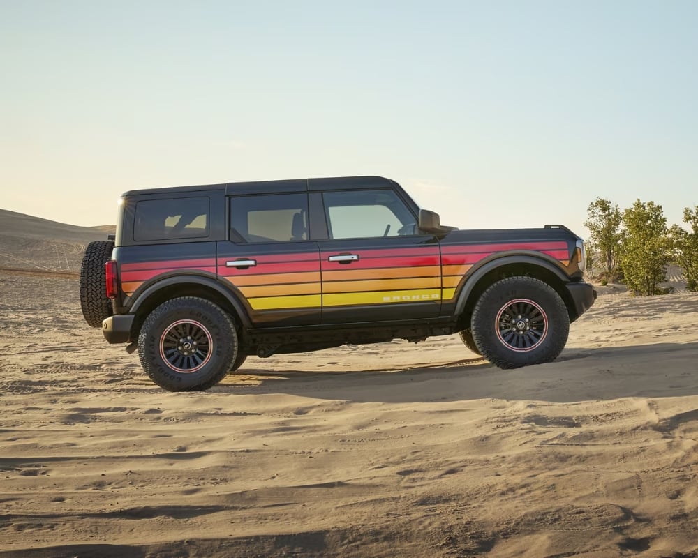 The Ford Bronco retains its rugged, muscular design while introducing fresh customization options. The new Free-Wheeling Edition features retro-inspired decals and 17-inch Carbonized Grey-painted machined-face aluminum wheels, evoking a 1970s aesthetic. Buyers can further personalize their Bronco with new colour choices like Marsh Gray, Desert Sand, and Ruby Red.